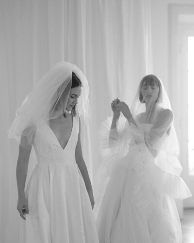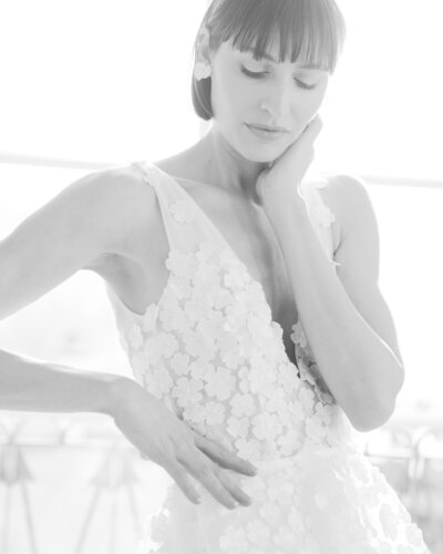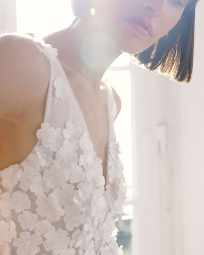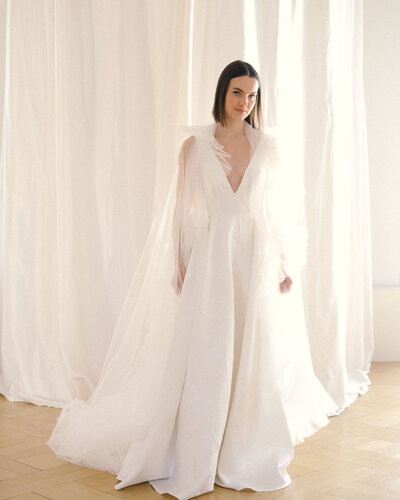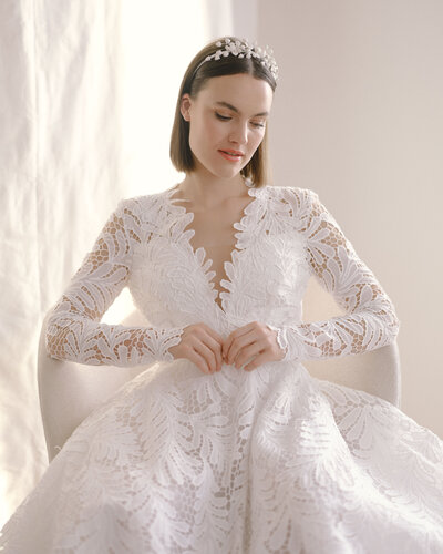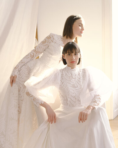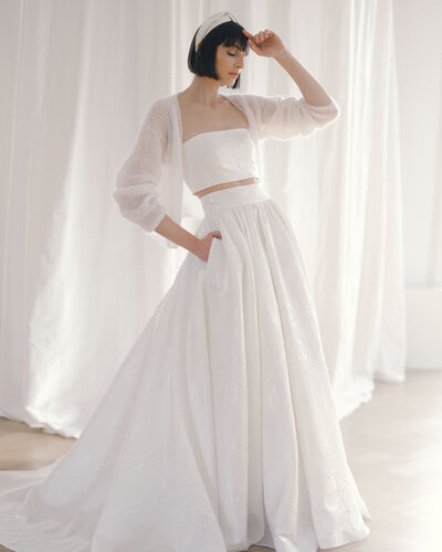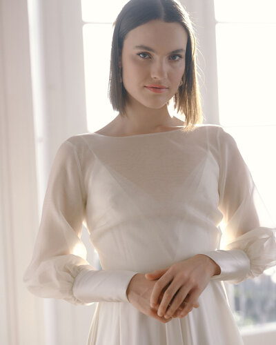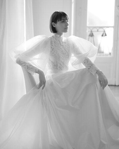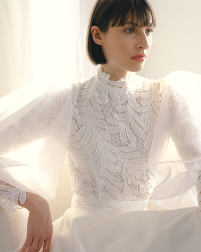 Der Zweiteiler JERLE besteht aus einem hochgeschlossenen Body, angefertigt aus einer aufregenden Spitze in Farnoptik. Für den großen Auftritt wurden Ballonärmel aus Seidenorganza hinzugefügt.
