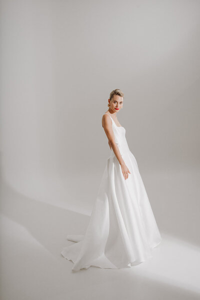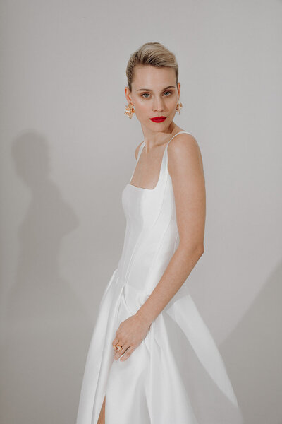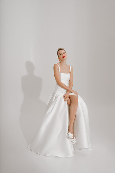 Die schmale A- Silhouette EIRA aus satiniertem Crêpe bringt Eleganz in Bewegung, während Corsage IVA mit ihrer besonderen Form und Material den Wow - Moment setzt.