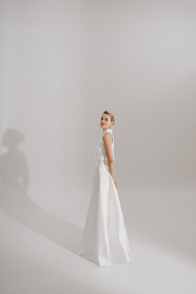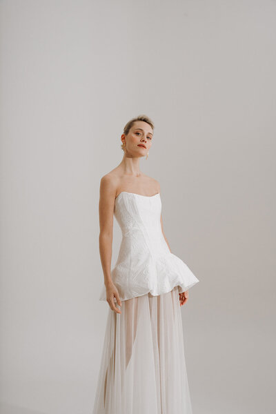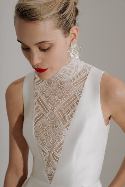 Ein Ensemble für Bräute, die den Mut haben, mit Formen, Ebenen und Details zu spielen.