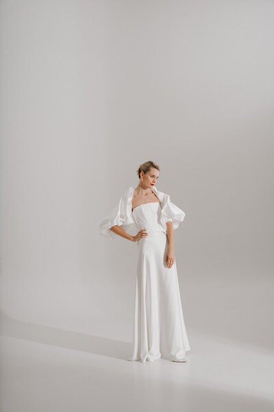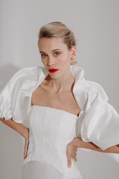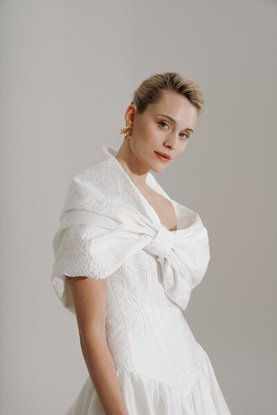 Das Statement-Piece? KEALA - ein drapierter Satin - Bolero, der jedes Bridal-Outfit in pure Couture verwandelt.