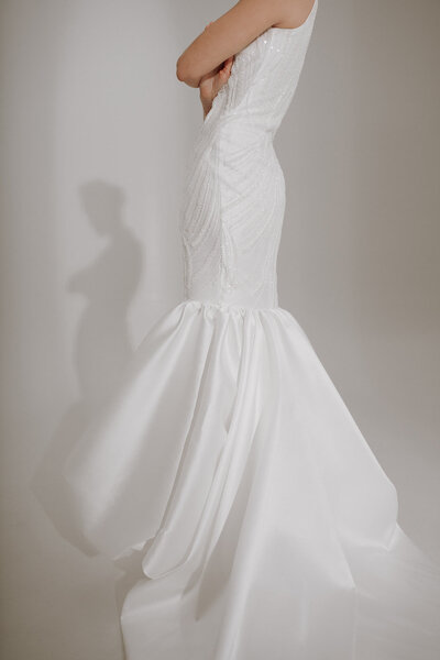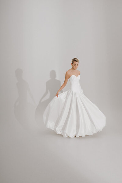 KIANA umschmeichelt die Silhouette mit einem grafisch strukturierten Oberteil und endet in einem dramatischen, drapierten Ballonrock mit Schleppe.