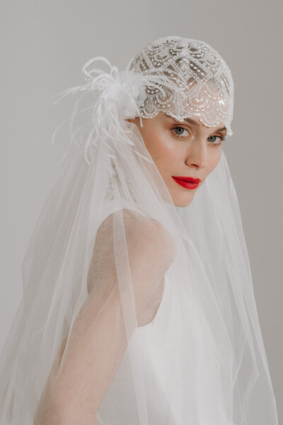 Der passende Schleier MALU krönt den Look - bestickt mit kunstvollen Perlenmustern, die wie ein Couture Kunstwerk den Kopf umspielen und die Braut mit purer Magie umhüllen