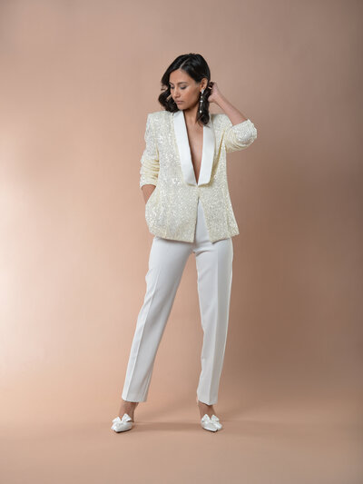 Der Blazer besteht aus recycelten Pailletten und wurde als Smoking gearbeitet. Somit siehst du nicht nur fantastisch aus, sondern tust auch noch etwas für die Umwelt.