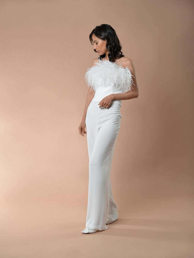 So auch die Hose - Sie hat den klassischen Smokingstreifen aus Satin an der Seitennaht. Die Hose ist aus blickdichtem Crêpe gearbeitet. Super elastisch mit hohem Tragecomfort.